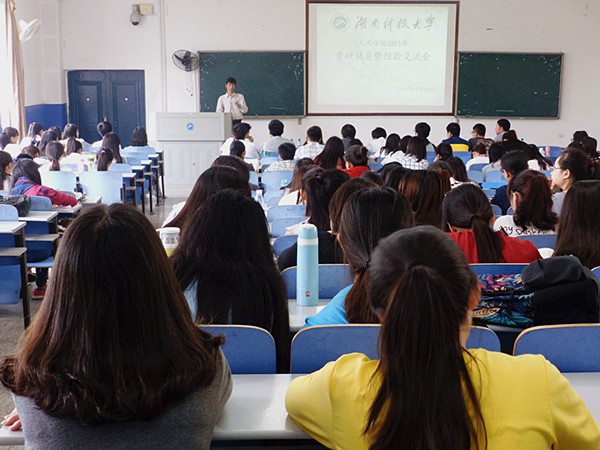 “现在社会就业形势严峻,考研可以提高竞争力;考研能将大学四年的知识进行系统复习,而且参加工作后再考研会增加考取的难度。考研主要考英语,要结合自身的英语水平选择学校和专业。”大会伊始,李院长从三个方面谈对考研的看法,鼓励12级学生做好考研准备。交流会中,考研取得优异成绩的四位学长学姐分别从自身考研经历出发,围绕如何选取学校和专业、制定复习计划、调整应考心态及复试的注意事项等方面谈了自己的亲身体验和感受。被华南师范大学文艺学专业录取的刘亮学长主要分享了如何进行考研复习的经验。他分别从专业课、英语和政治三方面展开:专业复习上,要依据考试大纲;英语方面,重在练习,多动脑,勤动手;政治方面,注重大纲解析,同时注意答题的条理性。考取河北师范大学汉语言文字学专业的田红欣学姐结合自身经历强调了关于时间安排和自习室的重要性。以总分389分的优异成绩考取北京师范大学中共党史专业的王宇凤学姐提醒12级备考同学考研应坚定信念、饱含信心。徐雪亮学长以专业第一的优异成绩考取广州大学戏剧与影视学专业,他就自己的考研准备与同学们进行交流,“我认为,一切努力都会在考试时体现出来的,考研准备得充分与否会是完全不一样的结果。”