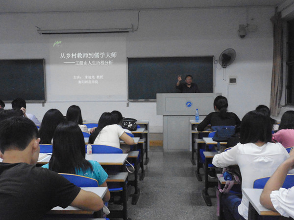 5月19晚,衡阳师范学院中文系朱迪光教授应邀来新葡萄官网讲学,就“王船山从乡村教师到国学大师的人生历程”这一主题,进行详细讲解和剖析。新葡萄官网学生及其他文学爱好者到场聆听。王友胜教授主持讲座。