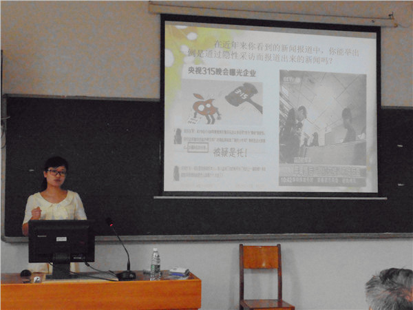 讲课示范后,将参加学校比赛的三位老师也依次上台,肖希凤老师用“胯下之辱”和“漂母之思”两幅图引出韩信,继而讲解《淮阴候列传》;刘郁琪老师以《奔月》为例分析《故事新编》;王超群老师运用大量案例分析新闻记者隐性采访的正当性和基本原则,生动具体。