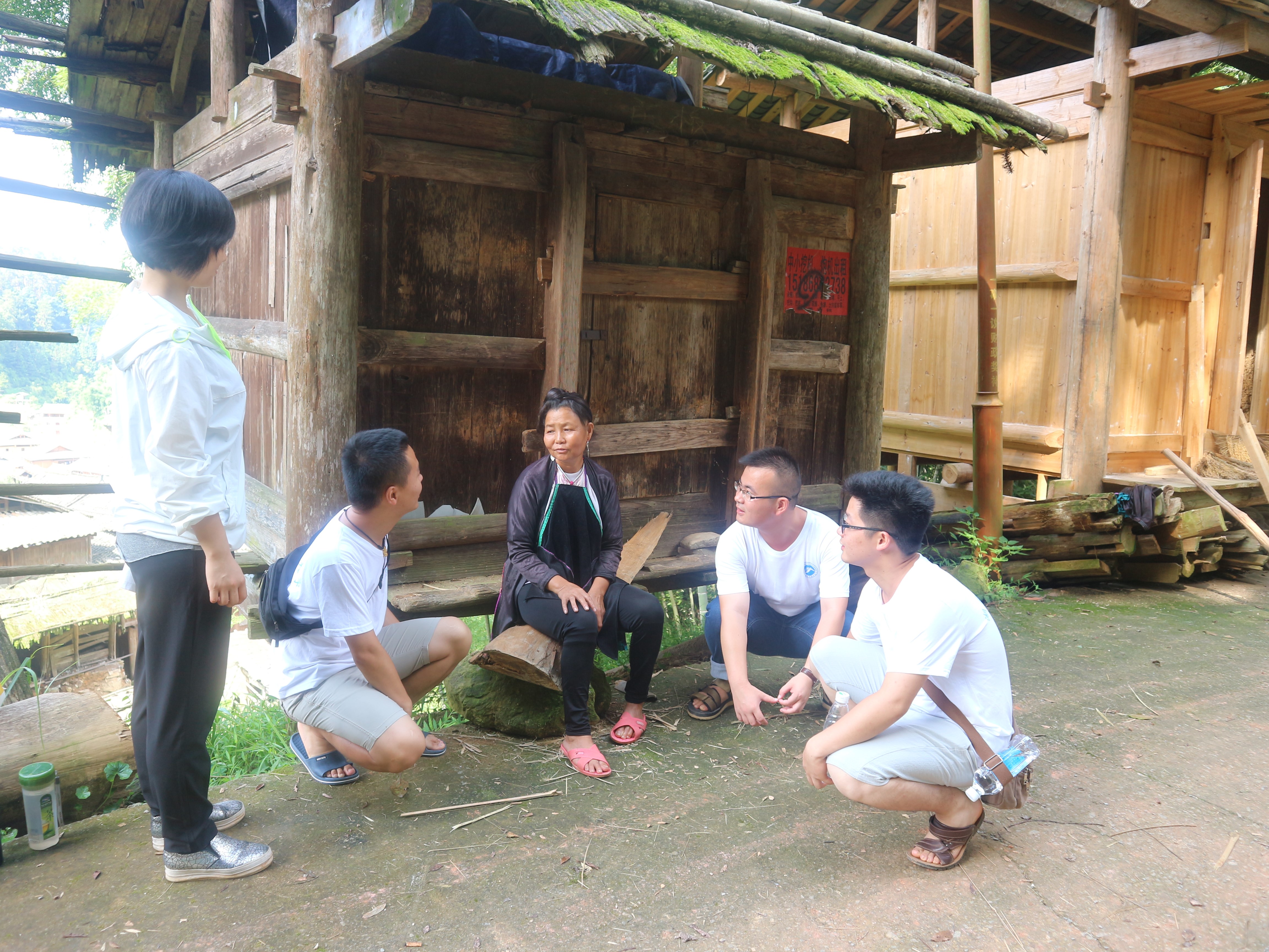 7月14日是个大晴天,为了更好地了解占里的旅游资源状况,团队成员们在当地向导的带领下顶着烈日,先后参观了占里的鼓楼、斗牛饲养棚、从江稻-鱼-鸭复合系统生态种养示范基地,并到农户家体验、学习了靛蓝染布工序、禾晾晒谷、糯稻脱粒等农事生产活动。在基本了解村寨情况的基础上,下午团队成员分组进入农户家中开展访谈调研,对于当地传统文化保存状况、传统文化传承措施及旅游开发政策等具体信息进行收集记录。同时采访了村寨的村干部和寨老等代表性人物,掌握了较为具体的信息材料,这对我们科技服务团队在接下来的旅游开发与传统文化保护项目的实地考察中进一步发现问题、提出意见建议和解决问题有了良好的开端。