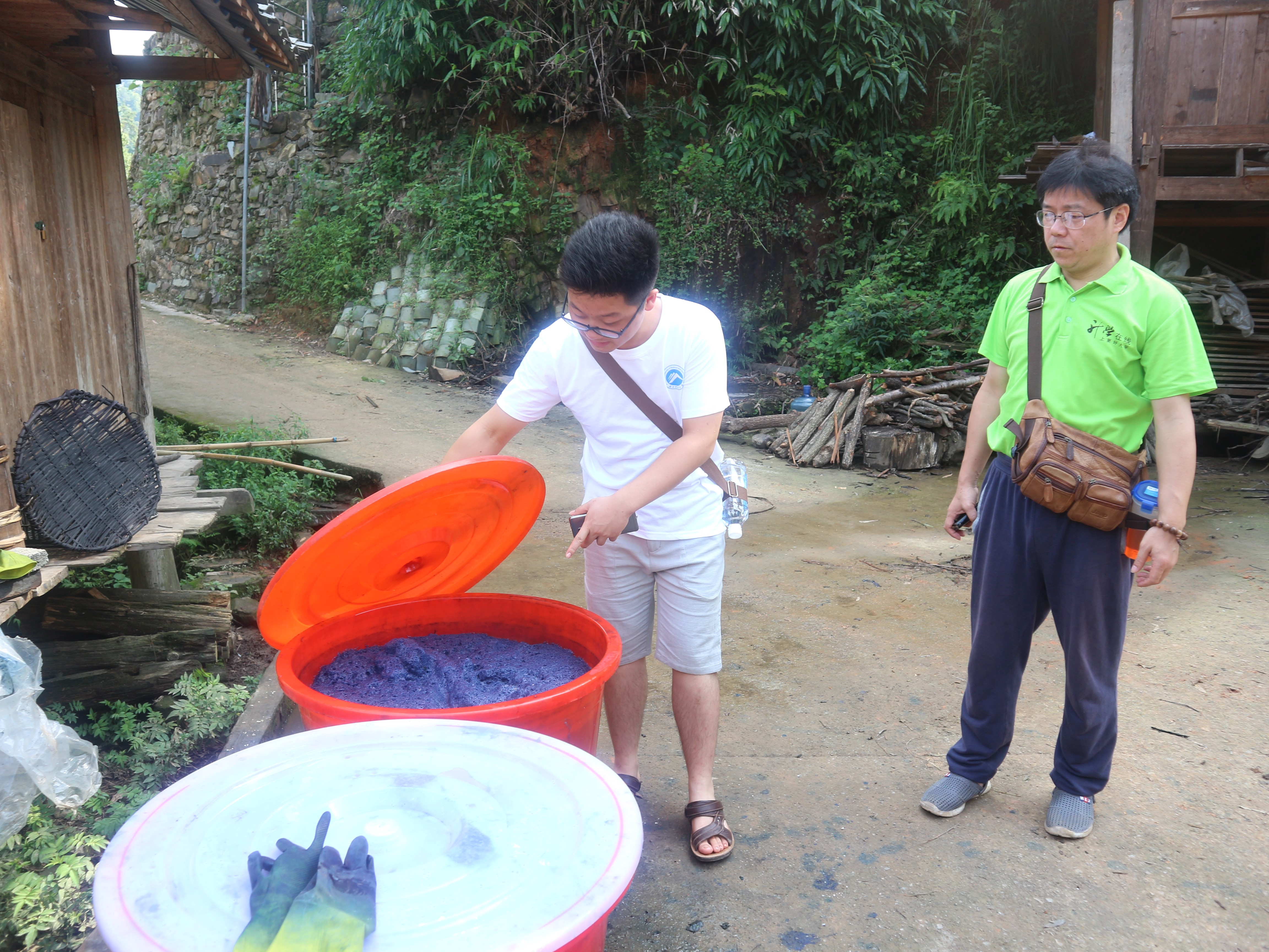 (图为新葡萄8883国际官网研究生暑期科技服务团成员在仔细观察靛蓝染缸)