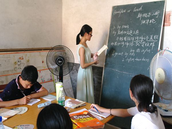 午后阳光炙烤过的地面,隐约氤氲着热气,初三的孩子们,坚持进行了热身活动,志愿者李煜两手托着篮球,站在孩子们面前详细讲解篮球知识及投球章法和技能。此外,对于初三的孩子们,志愿者对其进行极具针对性地授课,结合《新概念二册》等学习资料进行中考备考知识重点突破。志愿者张华艳在黑板上边写边对英语词性进行详细分析,孩子们不时抬头望着黑板,不忘低头做着笔记。当志愿者们询问初三孩子们的学业情况及目标高中及大学时,他们的青涩的脸上显露着对未知的憧憬,但大都表示想考上攸县一中,想考重点大学。