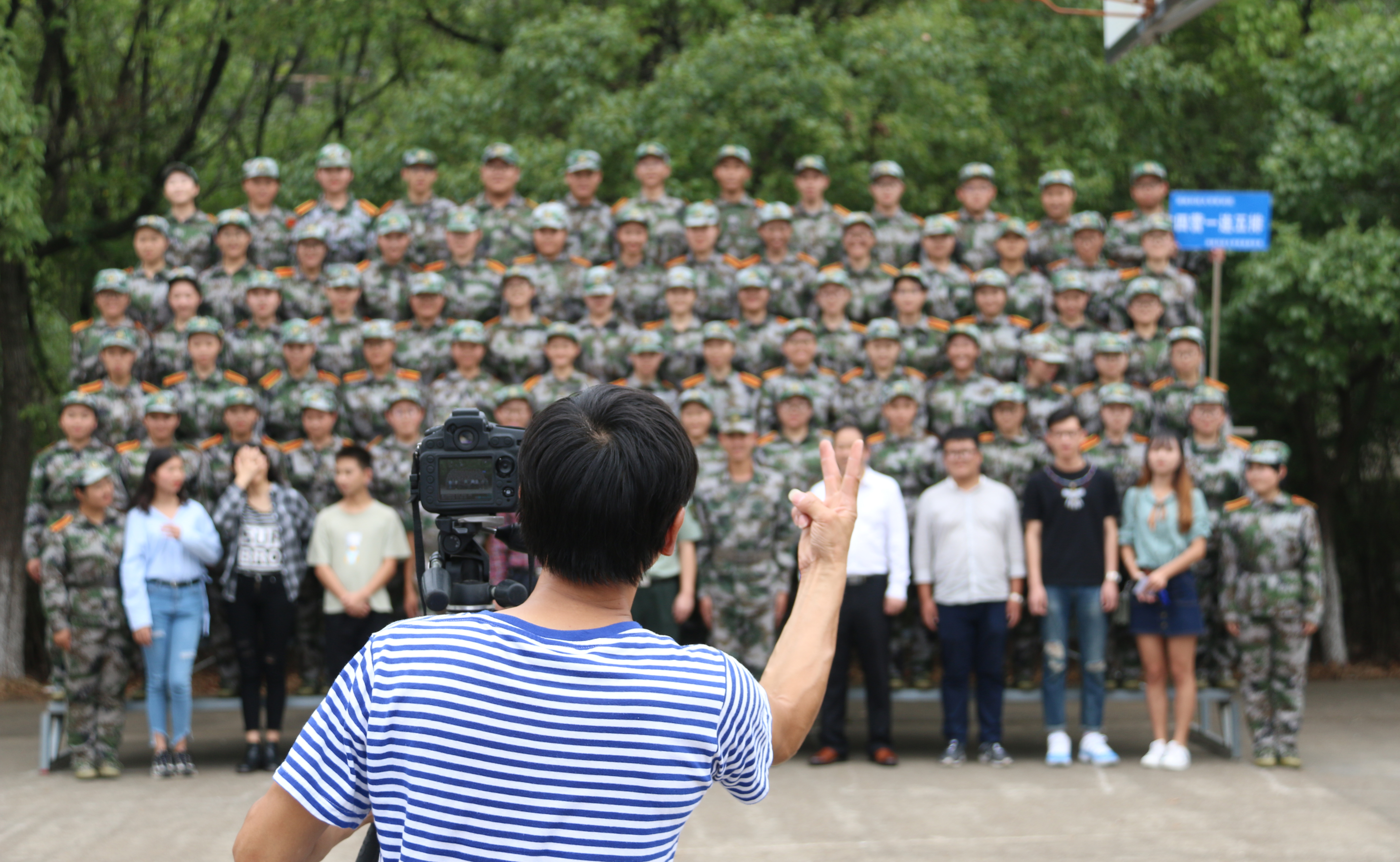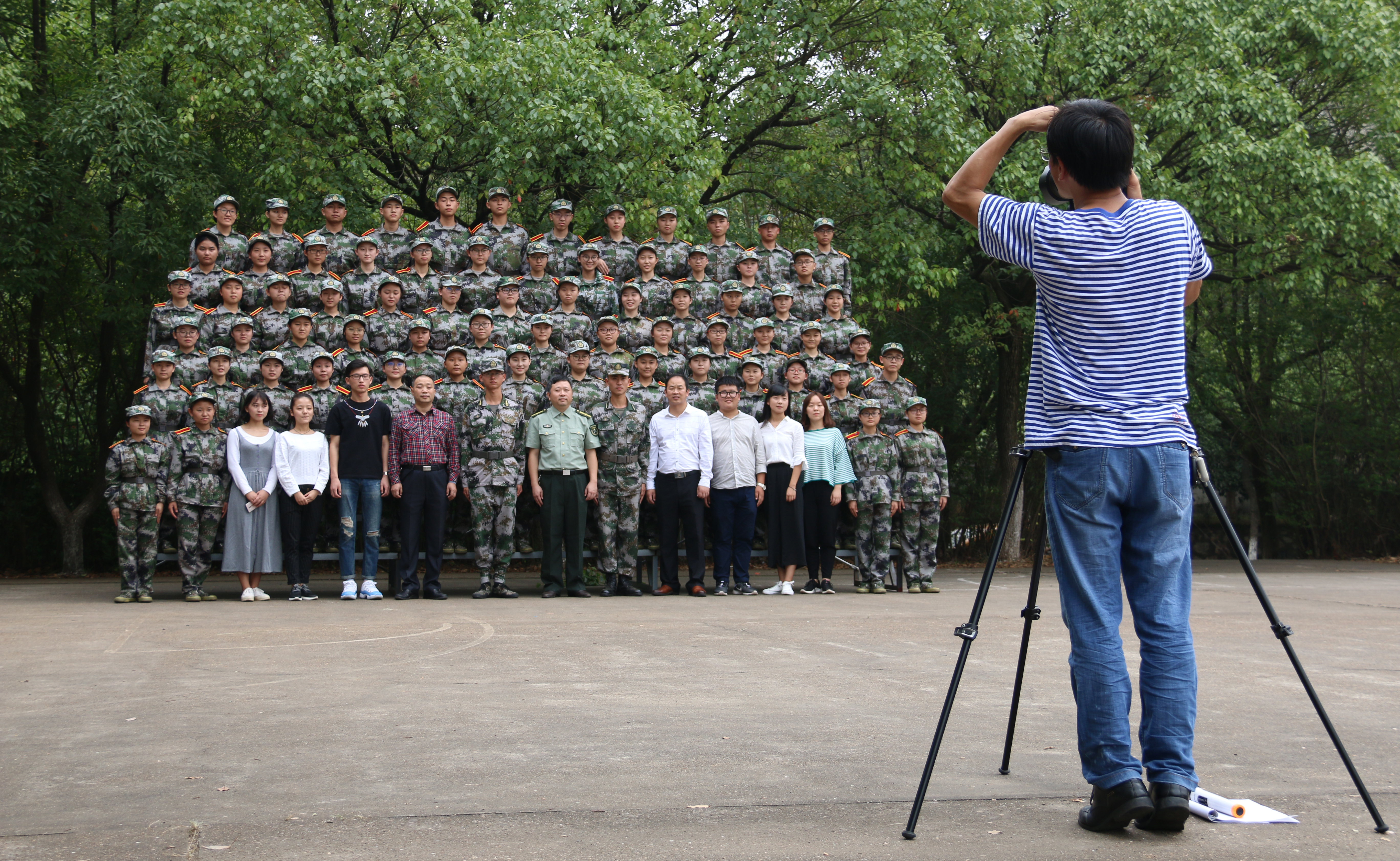 此后,在教官的口号带领下,新生以排为单位,端正军姿,在教官的带领下,学生们排好队整齐有序地走上铁质台阶。摄影老师耐心指导学生按高矮顺序调整好位置,不断与台上的学生们交流互动,带动起现场的气氛,以言简意赅的言语让师生们寻找到合适的取景角度;助班们不时帮新生整理军容,检查穿戴是否整齐;领导老师们则不时提醒着学生们当心台阶,当心踏空,注意好个人安全。