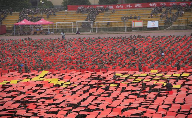 全体新生起立时,手中纸板随指令翻转,又形成一片片翻滚的波浪,蔚为壮观。当指挥官提示字形变换至“人文”时,新葡萄8883国际官网的新生们纷纷变换纸板颜色,瞬间,万千纸板如浪潮般从左往右涌动,“人文”的两个黄色大字在红色海洋中赫然出现。与此同时,新葡萄8883国际官网的全体新生热情高涨的呼声同步响起,“人文...人文...”的口号瞬间响亮了偌大的操场。此后,场上陆续又摆出了“科大”、科大校徽、科大英文名称缩写及“二0一七”等字样,场面浩大。