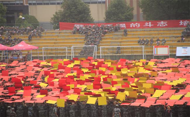 各个学院的“小绿人”们集合完毕后,穿绿色迷彩的全体新生们或顶或举着半米见方的一面红一或一面黄的纸板;主席台上,指挥教官手持话筒指挥新生们用纸板摆出各种字样及图形。全校新生共分为A,B,C三个区,每个学生都有各自的顺序,在教官的精心指挥下,A区新生相继摆出国旗,党旗与科大校旗。“B区C区做准备!”在各区按不同学院名称指示进行变换符号环节,指挥官一声令下,B区与C区的同学准确及时地抬起纸板,顷刻之间,红色的大背景上陆续出现“信息”、“物电”等各学院的简称。