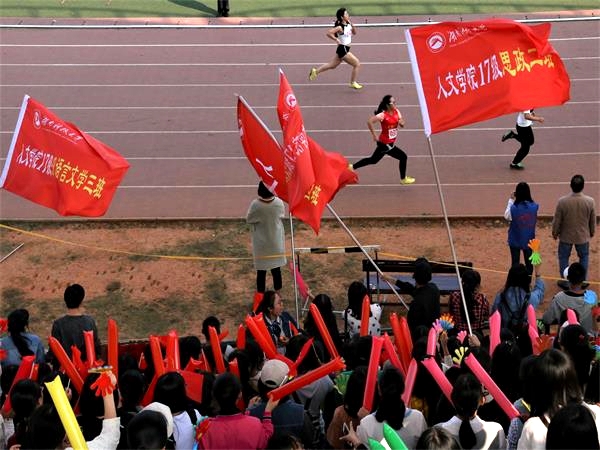 “人文,加油!春玲,挺住!”踏着节奏的点,在震耳欲聋的口号声中,新葡萄8883国际官网的院旗齐齐应景地飘扬在观众席上空,台下正值女子3000米赛场终点处,这狂热喧天的阵势,皆为16级新闻二班的宋春玲。