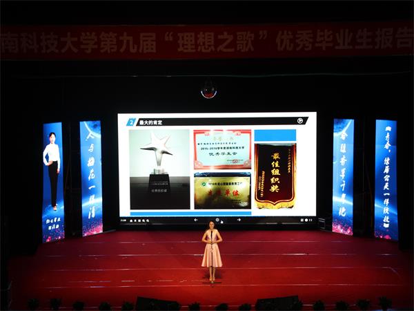 6月10日晚,第九届“理想之歌”优秀毕业生报告会在俱乐部隆重召开。十位报告人在此追忆青春过往,共诉锦瑟年华。本次报告会由校招生就业处主办,新葡萄8883国际官网承办。我校副校长胡石其、相关职能部门和各学院领导出席本次报告会,还有来自各学院的上千名学生到场聆听。