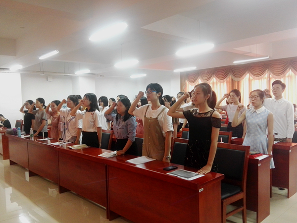 在全体与会成员奏唱国歌后,新葡萄官网学生党建办公室主任魏璇对本学期学生党建工作进行总结汇报。在党校培训工作方面,学院高度重视并探讨更好的培训模式,并在培训期间对预备党员严格考勤,预备党员也积极配合,努力学习,认真撰写培训心得,达到培训目的,取得了良好的效果。在学生党员发展工作方面,按照学校和党委的要求,坚持“严格标准、规范程序、努力培养、积极发展”的原则认真开展。除此之外,魏璇还从学生党员教育与管理 、毕业生党组织关系转移和档案整理、学生党支部重整等三个方面的工作作出总结。对党支部建设过程中存在的问题提出了相应的改进措施。总结完毕,王雨冰同学带领本学期34名新发展党员面向党旗庄严宣誓,郑思涵、刘倩文带领大家选读党章。
