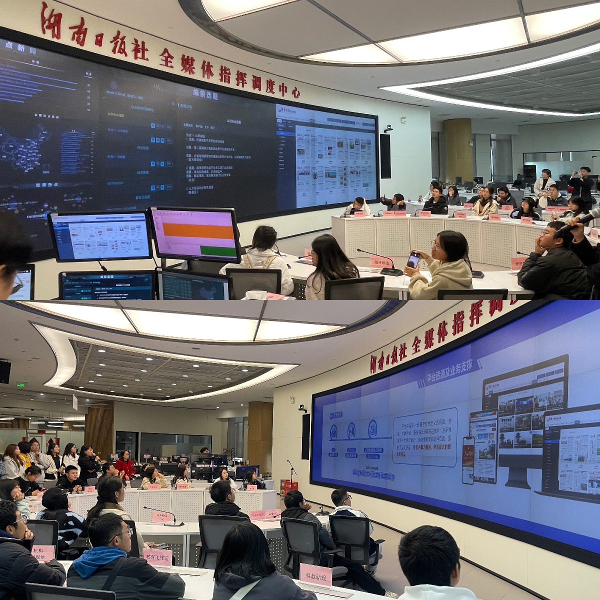 接下来,学生们参观了湖南日报中央厨房。作为湖南省传统媒体与新兴媒体深度融合的标杆,湖南日报中央厨房自2018年底投入使用以来,已成为内容生产、全媒体传播和舆情管理的重要平台。通过智能化的技术手段,中央厨房实现了新闻内容的集中生产和分发,极大提升了新闻传播的效率和精准度。在参观过程中,同学们亲眼见证了大数据分析如何支撑全省乃至全国舆情的监测与反馈,直观感受到了现代新闻生产模式的变革。这一体验让同学们对媒体融合的实际操作有了更深刻的理解,课堂上所讲的新闻传播理论也在现场得到了生动的映射。
