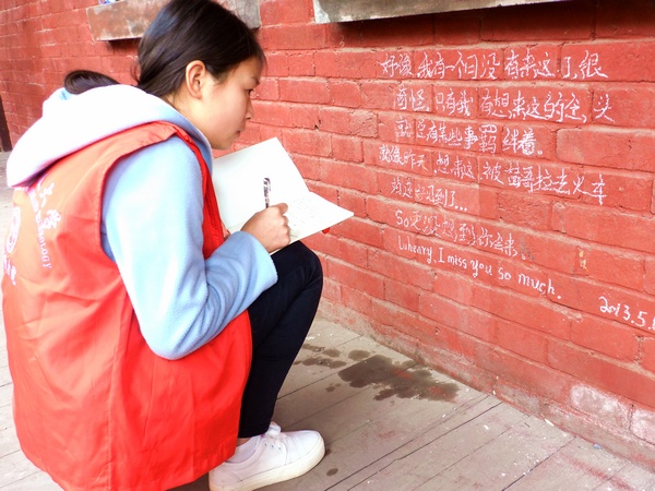 细心的志愿者将一句句留言工整地誊写在事先准备好的笔记本上,并还用红丝带将一个个笔记本系在墙上,“当做留言本,以后来参观的校友们就把他们的祝愿写在笔记本上,而不是在墙上信手留言,环保又温馨”志愿者孙杰笑着说。